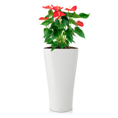 De rode Anthurium staat te schitteren in de moderne en elegante Lechuza Delta sierpot. De Anthurium, die oorspronkelijk voorkomt in Zuid-Amerika, is bekend vanwege zijn prachtige subtropische bloemen. Een Anthurium produceert het hele jaar door zijn schitterende bloemen en is daarmee één van de weinige kamerplanten die het hele jaar door bloeit. Het is zeer eenvoudig een Anthurium te onderhouden, zeker met de Lechuza Delta sierpot. Een geavanceerd watergeefsysteem dat de watertoevoer naar de wortels reguleert, zorgt voor een optimale bewatering van de plant. Hierdoor krijgt de plant altijd de juiste hoeveelheid water. Een handige watermeter geeft aan wanneer het reservoir moet worden bijgevuld. Door de eenvoudige verzorging is de Anthurium één van de weinige bloeiende kamerplanten die zeer geschikt is om kantoren op te fleuren.