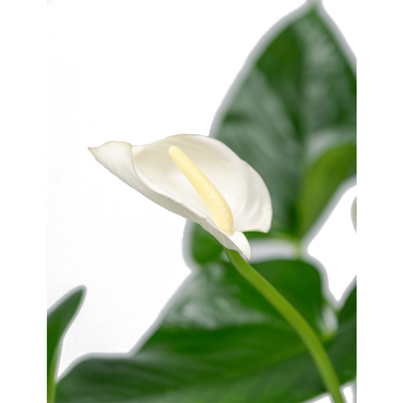 De witte Anthurium met groene bladeren staat schitterend in deze Vera bloempot. De Anthurium, die zijn oorsprong vindt in Zuid-Amerika, is bekend vanwege zijn prachtige subtropische bloemen. Een Anthurium produceert het hele jaar door schitterende bloemen en is daarmee één van de weinige kamerplanten die het hele jaar door bloeit. De plant is onderhoudsvriendelijk en daarom ook geschikt voor kantoren, waar hij het hele jaar door kleur brengt.