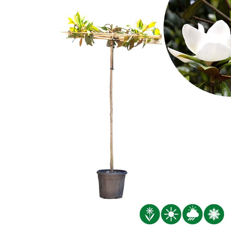 De Magnolia Grandiflora is een erg decoratieve boom die ook als struik voorkomt. Sommige magnolia's zijn ook in dakvorm verkrijgbaar zoals deze variant. In juni en juli bloeit de boom met grote witte tulpvormige bloemen. Het blad van de magnolia is glanzend donkergroen met een bronzen onderkant. De boom krijgt een hoogte tot zeven meter. Hij behoudt zijn bladeren in de winter en is goed winterhard. De Magnolia Grandiflora hoeft niet gesnoeid te worden. Haal enkel de gebroken en kruisende takken weg, dit is meer dan voldoende. Doe dit niet in de winter, maar in de zomer voor de bloei. De beverboom verdraagt elke bodem goed en verlangt naar een zonnige plek in de tuin.