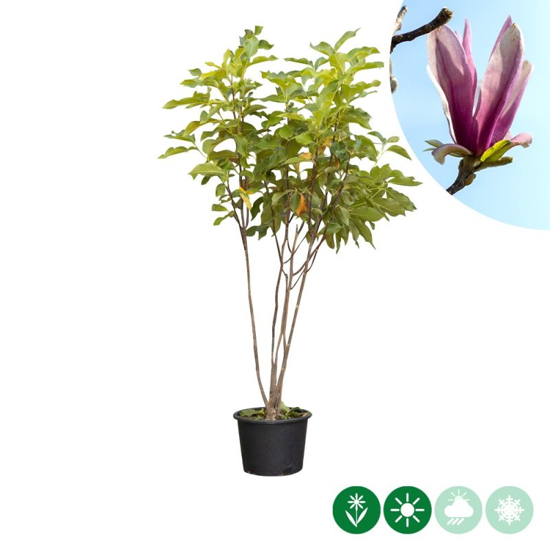 De Magnolia Spectrum is een prachtige boom die in het voorjaar de show steelt met een prachtige bloei van donkerroze en violette bloemen. De boom heeft grote groene bladeren die in de herfst geelbruin kleuren. De Magnolia Spectrum groeit relatief minder langzaam dan de andere soorten Magnolia's. De boom kan maximaal zeven tot acht meter hoog worden. Aangezien de boom de eerste jaren windgevoelig kan zijn, is het verstandig om twee ondersteundende boompalen te gebruiken bij het aanplanten. De Magnolia Spectrum is een bladverliezende, maar winterharde boom. Hij doet het goed op iedere grondsoort en is onderhoudsvriendelijk. Zet de boom op een plek in de zon of halfschaduw en snoei de boom in april of mei. Verwijder hierbij de takken die te dik zijn en zorg er zo voor dat de vaasvorm of eivorm van de boom behouden blijft.