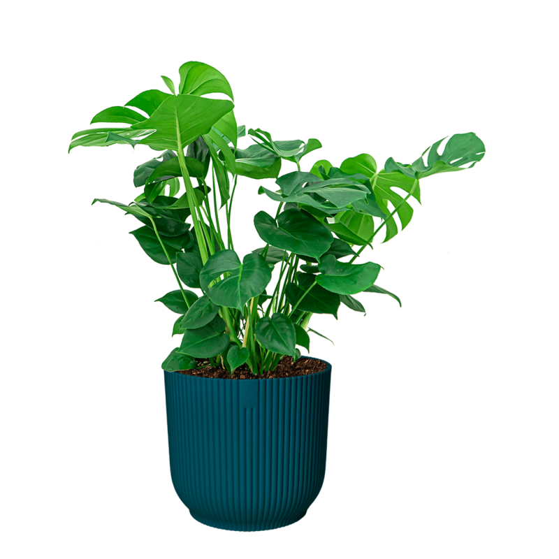 De Monstera Deliciosa gatenplant is een populaire kamerplant. De speelse bladeren hebben een frisgroene kleur geven een unieke sfeer. Van nature is de gatenplant een klimplant die zich met zijn wortels aan rotswanden hecht. Naast de mooie verschijning is de gatenplant ook makkelijk in verzorging. Zet de plant op een goed verlichte plek en geef zo'n twee keer in de week een kleine scheut water. In de Elho Vibes pot komt de plant goed tot zijn recht. De pot is gemaakt van 100% gerecycled plastic en is verkrijgbaar in vier moderne, zachte kleuren. De potten zijn daarnaast licht van gewicht en dus makkelijk in gebruik.