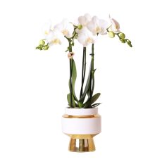 Deze prachtige Amabilis orchidee schittert in de gouden Luxueus pot. De orchidee heeft volledig witte bloemen en groeit met 2 tot 3 stevige takken. Deze orchidee is perfect gecombineerd met de zilveren Luxueus pot, een sierpot die je steeds vaker in stijlvolle interieurs zult tegenkomen. De pot is wit en herkenbaar aan zijn zilveren accenten. Hij heeft een gladde afwerking en een potmaat van 9 cm, waarmee hij de glamour en elegante stijl helemaal compleet maakt.