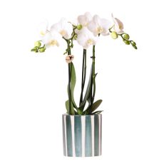 Breng wat zomerse kleuren in je interieur met deze prachtige oranje orchidee in een opvallende Painted Stripe sierpot. Met 2 of 3 takken zorgt deze orchidee voor een echte eyecatcher in elke ruimte. De pot, gemaakt van keramiek, heeft een potmaat van 9 en heeft een glanzende afwerking. Voeg een vleugje frisheid toe aan je huis met deze mooie combinatie van plant en pot.