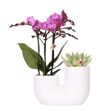 Deze unieke duo pot is ontworpen om op te vallen en is perfect voor een prominente plek in huis, zoals een boekenplank, bijzettafel of vensterbank. De orchidee voegt verfijning en zachtheid toe, terwijl de succulent zorgt voor een moderne en minimalistische uitstraling. Samen vormen ze een stijlvol geheel dat moeiteloos past in uiteenlopende interieurstijlen.