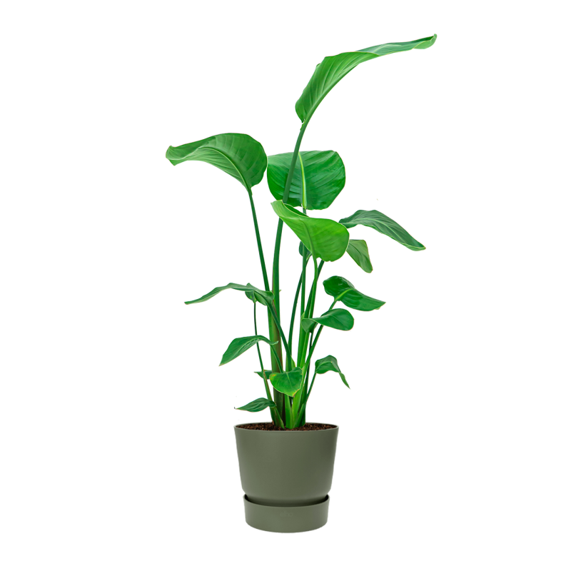 De Strelitzia Nicolai is prachtig in de elegante Elho Greenville pot. De Strelitzia Nicolai is afkomstig uit Zuid-Afrika en heeft grote, vederachtige bladeren die de ruimte omtoveren in een ware jungle. In de vrije natuur wordt de plant tot wel 10 meter hoog. De grote gehavende bladeren kunnen scheuren, dit is een natuurlijk proces van de plant en valt niet te voorkomen. De bladeren vangen namelijk in de vrije natuur veel wind en door het inscheuren van de bladeren zullen deze minder makkelijk afbreken. Een natuurlijk beschermingsmiddel dus. De Elho Greenville pot heeft een ingebouwd waterreservoir. Dit houdt de plant mooi zonder hem steeds opnieuw water te hoeven geven. Verder is deze pot gemaakt van 100% gerecycled materiaal!