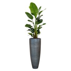 De Strelitzia Nicolai komt oorspronkelijk uit Zuid-Afrika en heeft grote, vederachtige bladeren die je huis omtoveren in een ware jungle. In de vrije natuur wordt de plant tot wel 10 meter hoog. De Strelitzia is een stoere plant met gehavende bladeren. Deze gescheurde bladeren dienden als een natuurlijk beschermingsmiddel tegen het afbreken van het blad en zijn kenmerkend voor de plant. In de handgemaakte Metallic Partner pot krijgt de Strelitzia Nicolai een elegante uitstraling. De pot is volledig bedekt met bladzilver waar een transparant gekleurde laklaag overheen zit. De pot zelf is gemaakt van composiet en daardoor licht van gewicht. Een sierlijke pot en makkelijk in gebruik!