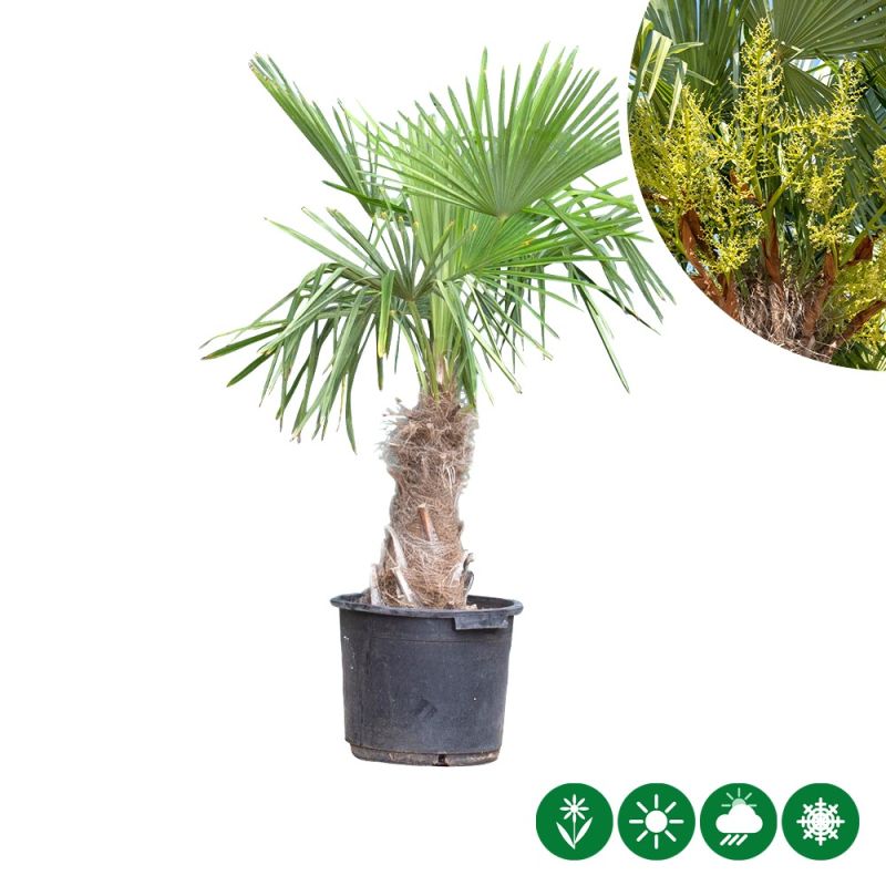 Breng je tuin in mediteraanse sferen met de Trachycarpus Fortunei! De boom staat ook wel bekend als de Chinese waaierpalm en heeft groene stengels met frisgroene waaiervormige bladeren die ook in de winter hun kleur behouden. De palm is bestand tegen vorst en kan zelfs tegen temperaturen tot -16 graden Celcius. Bij langdurige vorst is het echter wel verstandig om de boom in te wikkelen met een vliesdoek.